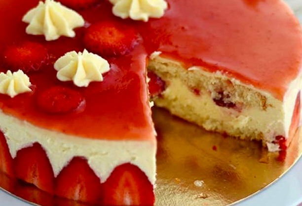 - Après ces 3 heures, bien agiter la gelée de fraises tempérée et l’ajouter sur le dessus du gâteau et la lissant bien. Remettre au réfrigérateur pour 2 heures.