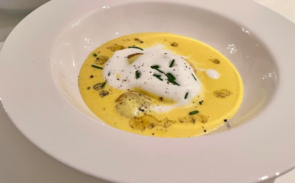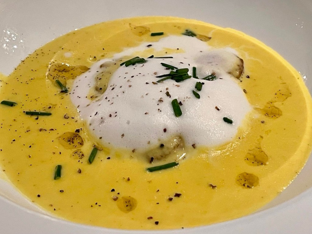 - Pour le dressage, déposer les fruits de mer au centre de 4 bol bien chauds, verser autour la crème de maïs, puis, au centre une quenelle de lait moussant. Perler le potage de gouttes d’huile parfumée à la vanille et garnir de ciboulette ciselée.